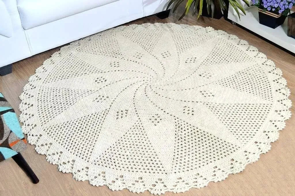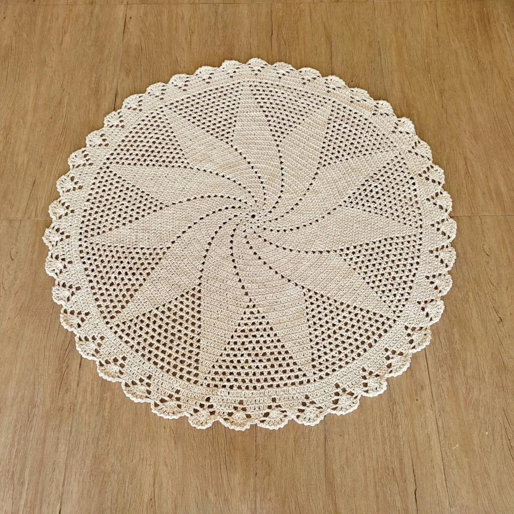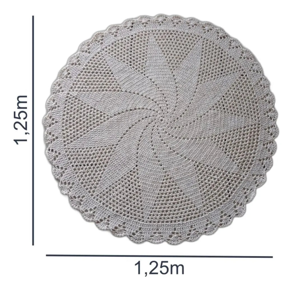 Tapete De Crochê Redondo Para Sala Apartamento Criativa Esse lindo tapete em crochê feito à mão utilizando um fio de barbante 100% algodão vai deixar a sua casa um encanto e trazer junto com isso muito mais conforto e elegância ao seu lar! Podem ocorrer pequenas variações nas medidas devido ao produto ser feito à mão. CONTEÚDO: 1 tapete redondo para sala feito à mão. MEDIDAS: 1,25m X 1,25m. CORES: Conforme as fotos ilustrativas. *Fotos reais dos tapetes* COMO LAVAR: COMO LAVAR UTILIZANDO O TANQUE: 1. Encha o tanque antes de colocar o tapete. 2. Dê preferência ao sabão líquido, pois ele dissolve melhor na água. Se for em pó, certifique que ele esteja bem dissolvido. 3. Você pode utilizar o sabão de coco que é ideal para peças sensíveis. 4. Esfregue delicadamente o sabão, sem utilizar escovas ou torcer a peça. 5. Deixe secar horizontalmente, um varal de chão é ideal. COMO LAVAR UTILIZANDO A MÁQUINA: 1. Se for a primeira lavagem de uma peça colorida, ela pode soltar um pouco de tinta, por isso lave separadamente. 2. Assim como no tanque, dissolva bem o sabão na água. 3. Sempre escolha a opção para “ROUPAS DELICADAS” na hora da lavagem. 4. Não utilize o Modo de Centrifugação, esse movimento pode danificar o tapete. 5. Coloque para secar horizontalmente. DICAS PARA MANTER OS SEUS TAPETES COM CARA DE NOVO: - Não utilize produtos como alvejantes ou desinfetantes, os tapetes são peças delicadas. - Evite passar ferro nos tapetes. - Coloque para secar na sombra, sem contato direto com a luz do sol. - Não deixe os tapetes de molho. - Se o tapete for manchado, aplique um pouco de tira manchas somente na parte manchada. - Não deixe seu tapete secar pendurado num varal verticalmente como as outras peças.