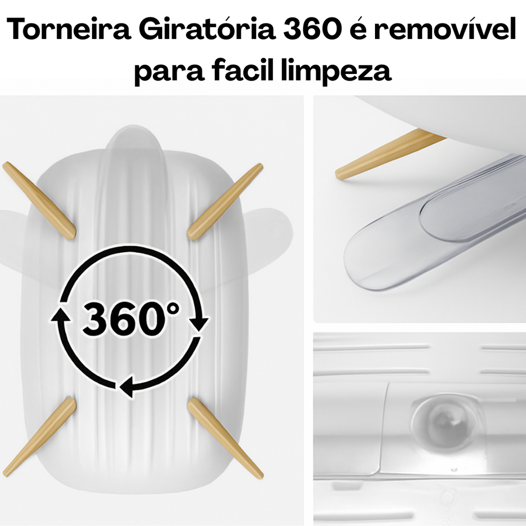 O bico giratório removível direciona a água diretamente para a pia, eliminando poças e garantindo uma secagem rápida, higiênica e livre de manchas na bancada.