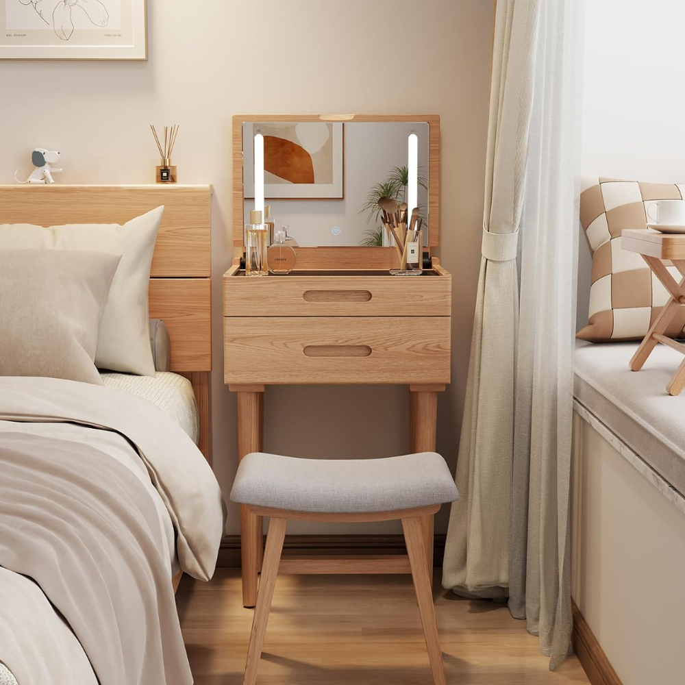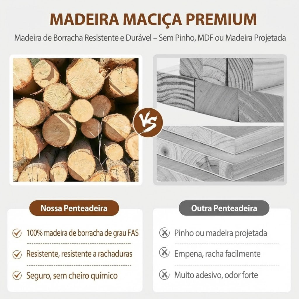 Diferente das penteadeiras comuns de MDF que descascam com o tempo, a Zenn é feita em Madeira Maciça de Seringueira, garantindo durabilidade extrema e um acabamento sofisticado que valoriza seu ambiente.